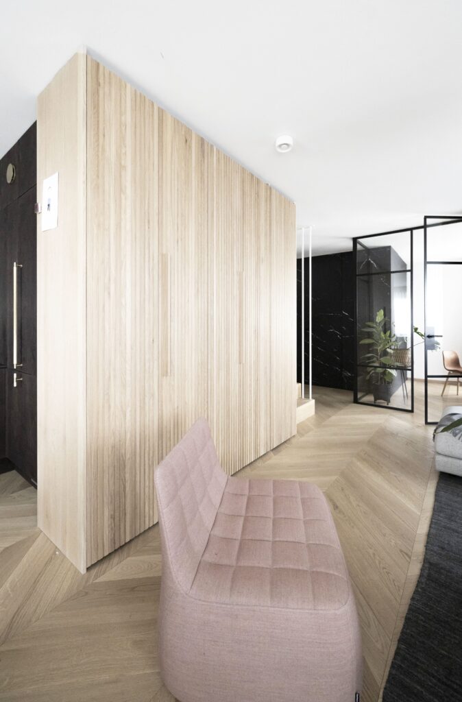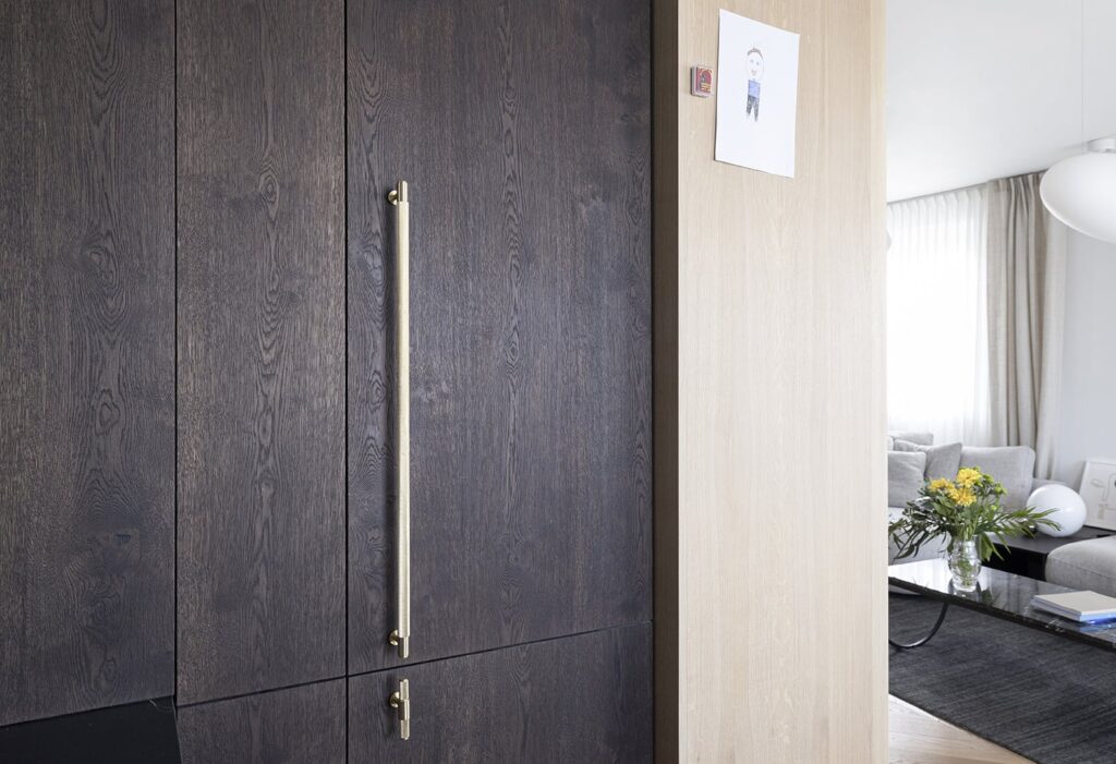 Główną zmianą była przebudowa schodów prowadzących na piętro. Zamiast ażurowej konstrukcji wykonaliśmy pełne biegi schodów z drewna. Dzięki temu powstało dużo dodatkowych szafek i półek, które ukryliśmy pod stopnicami. Dodatkowo schody rozbudowaliśmy o garderobę i szafę RTV. Plusem tego rozwiązania było to, że pomieszczenie zyskało wyraźniejszy podział na część wypoczynkową i kuchnię.